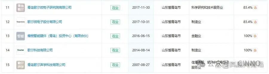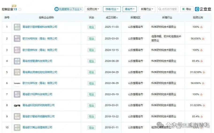 近年来,歌尔股份也一直依托旗下主要业务板块在青岛进行全面布局。据企查查信息,歌尔股份目前在青岛实控企业15家,其中包括歌尔科技有限公司、青岛歌尔微电子股份有限公司与歌尔光学科技有限公司等知名子公司。